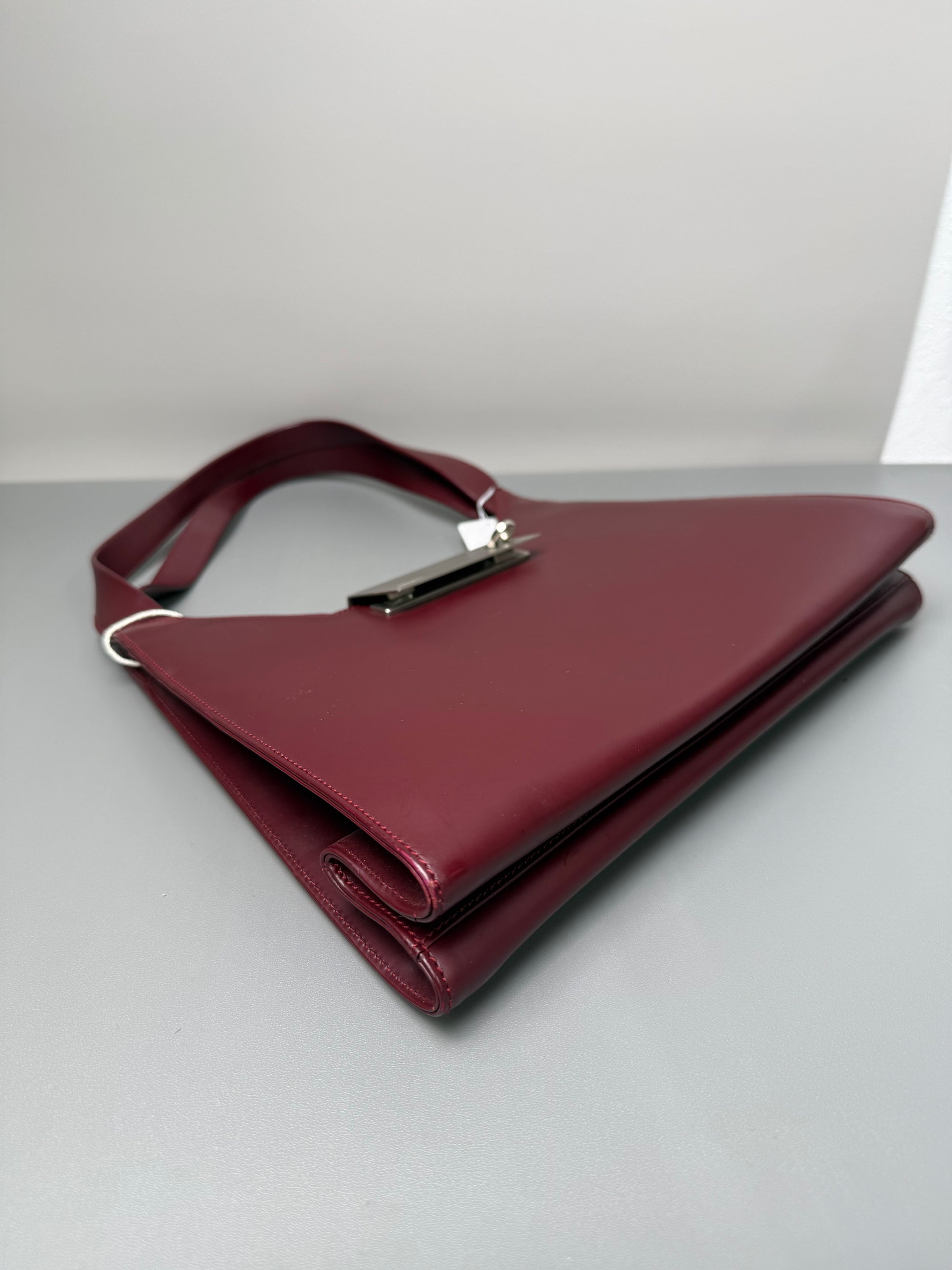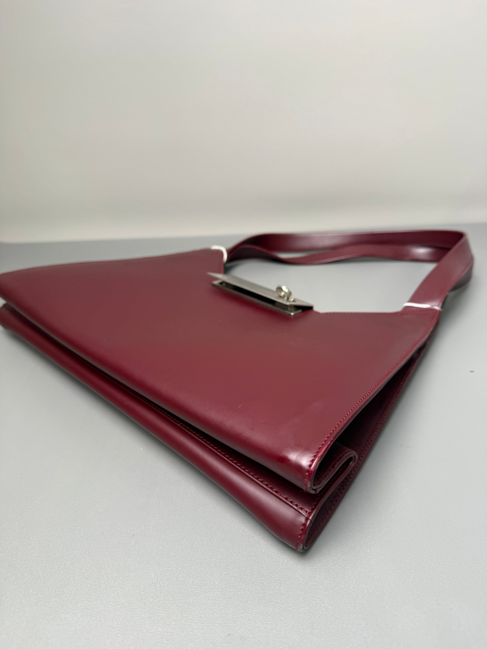Crafted from smooth, luxe burgundy leather, this sleek shoulder bag features the brand’s iconic Gancini silver-tone clasp for a signature finish. Its minimalist, structured silhouette offers ample space for daily essentials, balancing timeless Italian craftsmanship with modern elegance to elevate any outfit.