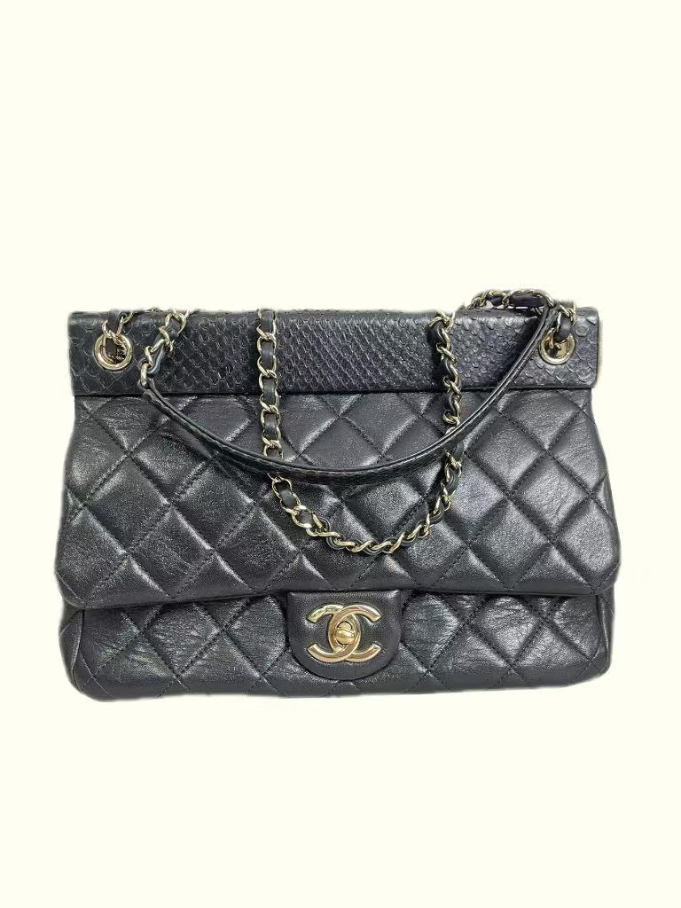 香奈儿 黑色小羊皮蛇皮皮革边框中号经典单翻盖包