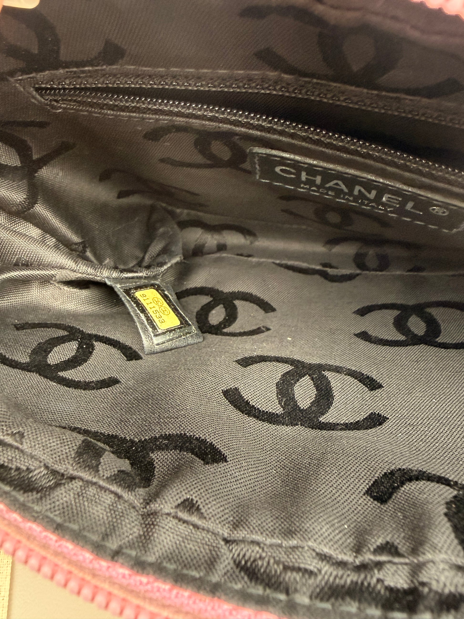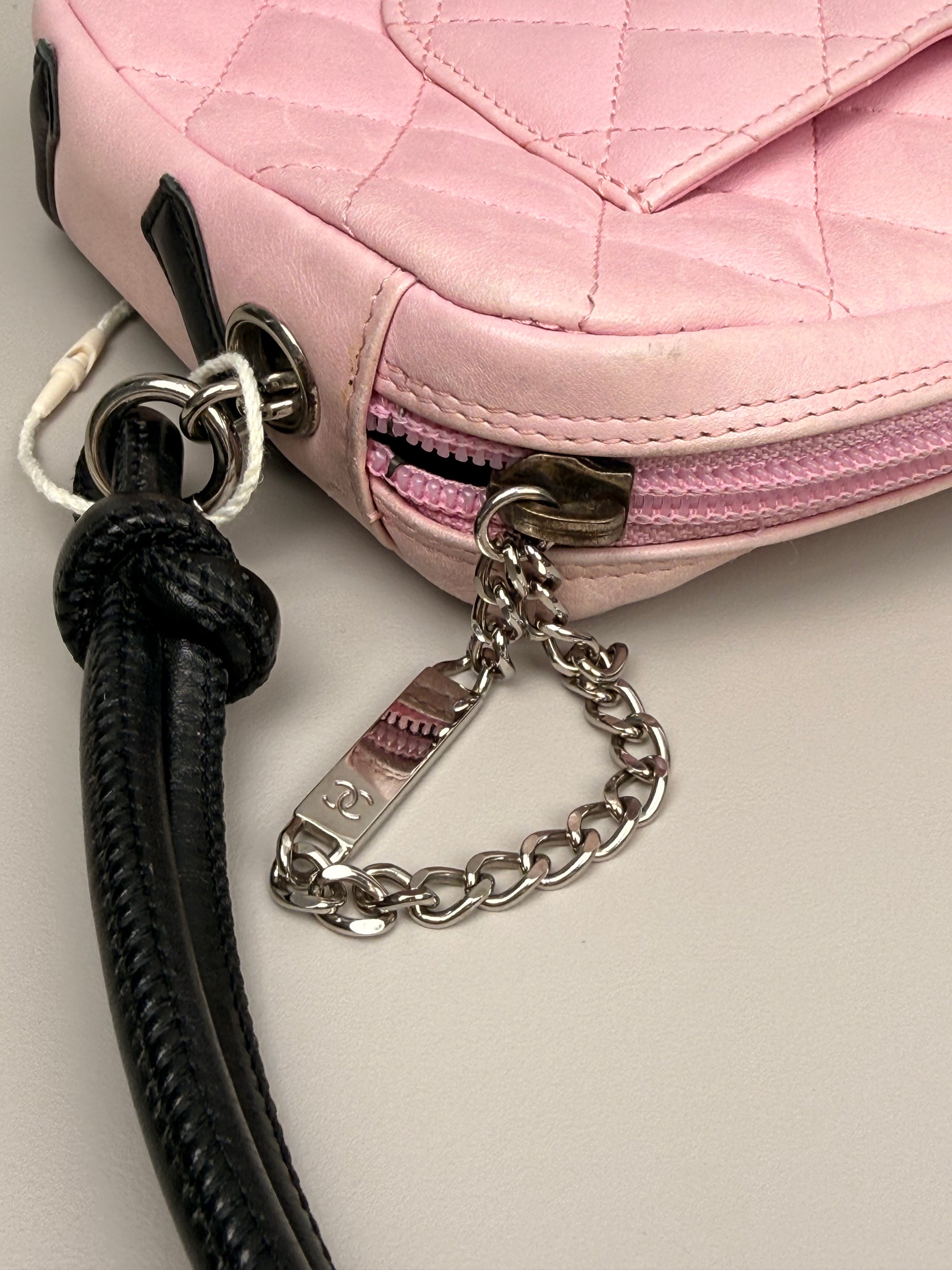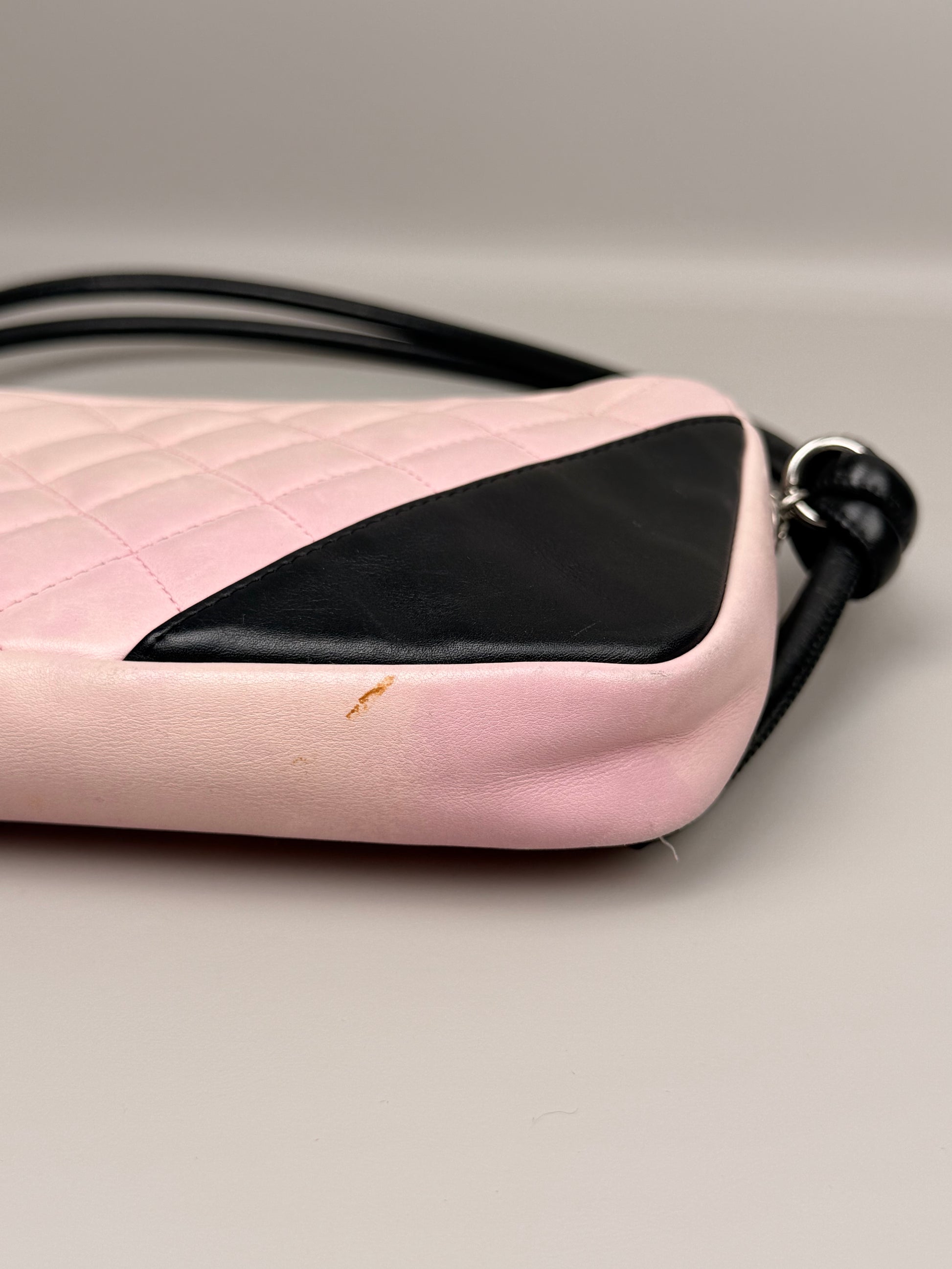This stunning vintage Chanel Cambon small rectangular bag showcases a chic black-and-pink leather composition. Subtle signs of pre-loved character include gentle leather wear, faint discoloration, and minor corner scuffs, plus light interior patina—all consistent with its timeless charm. The authenticity code inside remains fully legible. This piece arrives complete with its original dust bag and authenticity card, making it a coveted addition to any luxury collection.
