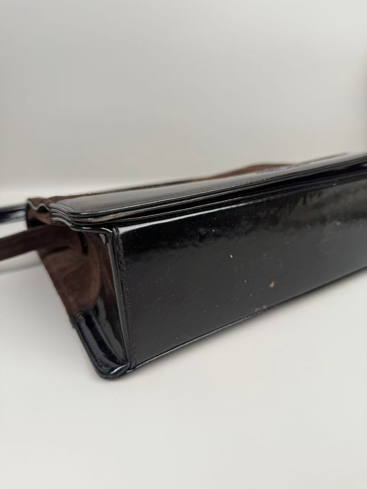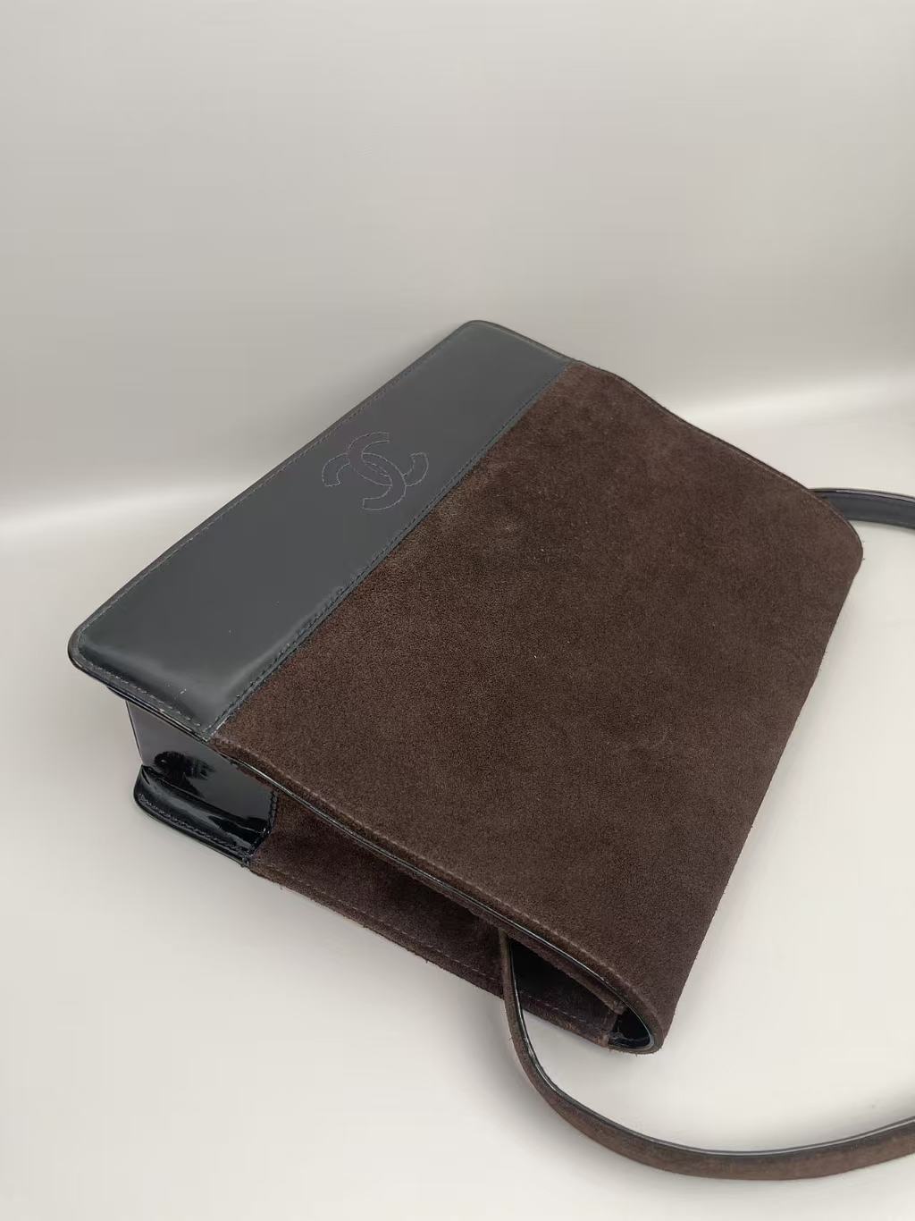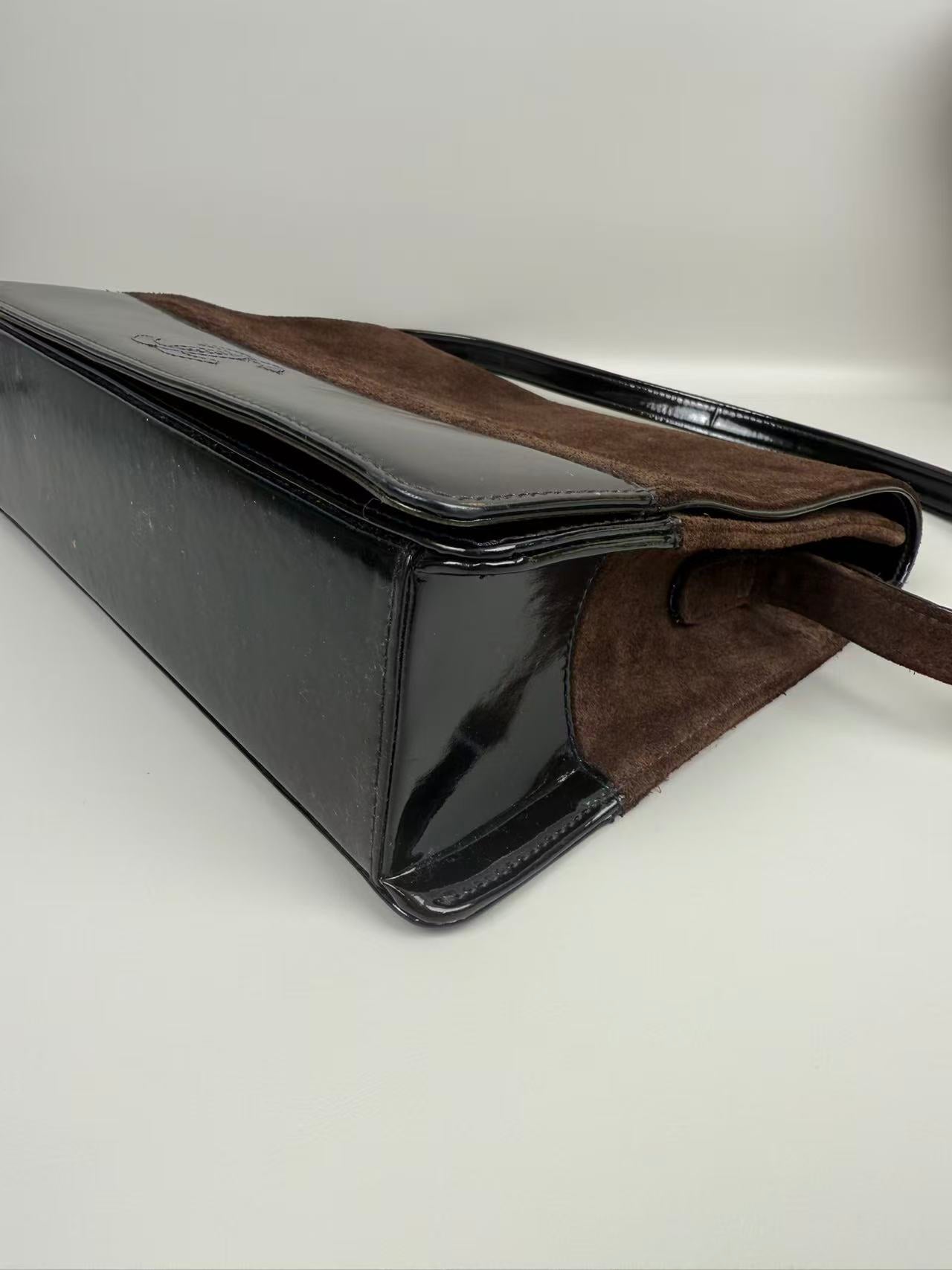 This Chanel Vintage Shoulder Bag is a unique blend of textures. Featuring brown suede and black patent leather, it showcases the iconic double-C logo. The sleek silhouette with a single shoulder strap offers a sophisticated, retro charm. It embodies Chanel’s craftsmanship and timeless design, making it a standout piece for elegant, vintage-inspired styling.