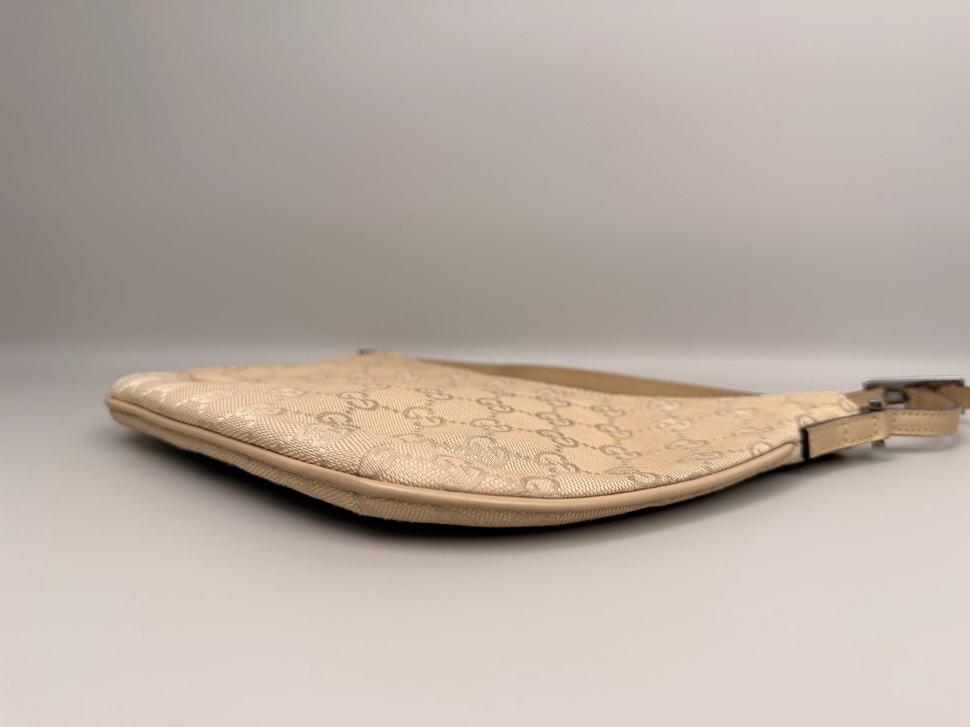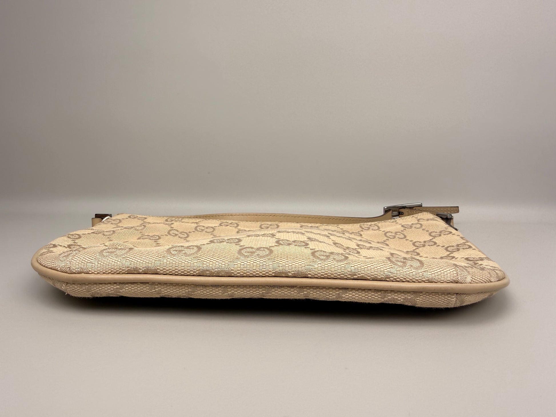This pre-loved Gucci monogram shoulder bag features the iconic beige GG Supreme canvas, paired with brown leather trim and an adjustable shoulder strap. The slouchy, curved silhouette delivers effortless 90s-era Gucci charm, with a spacious interior for everyday essentials.